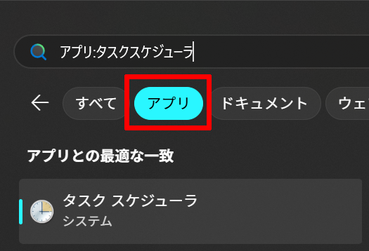 まずスタートボタンから「タスクスケジューラ」と入力して、アプリを表示します。