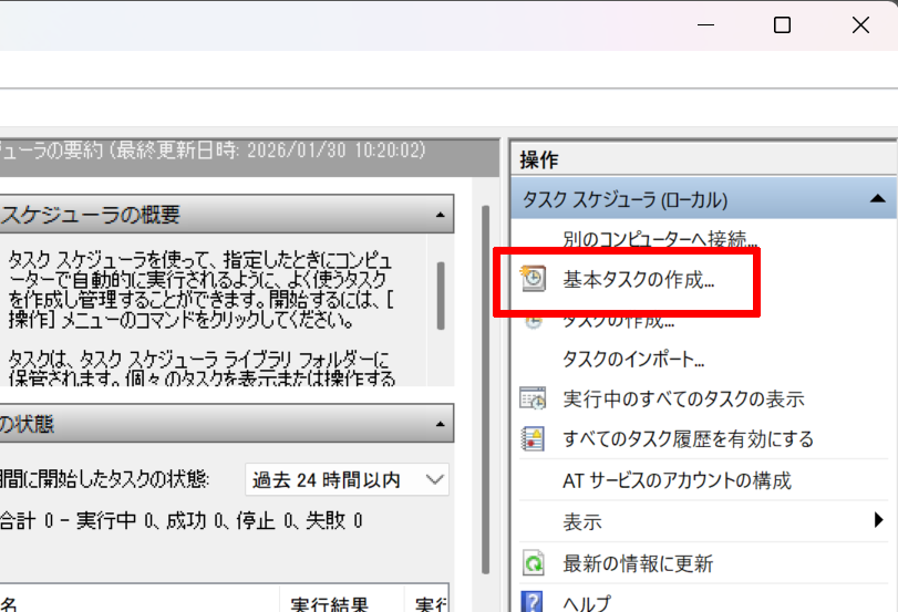 タスクスケジューラが表示されたら、右上の基本タスクの作成を押下します。