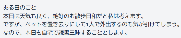 $sentence = 'ある日のこと'.PHP_EOL.'本日は天気も良く、絶好のお散歩日和だと私は考えます。'.PHP_EOL.'ですが、ペットを置き去りにして1人で外出するのも気が引けてしまう。'.PHP_EOL.'なので、本日も1人で読書三昧することとします。';